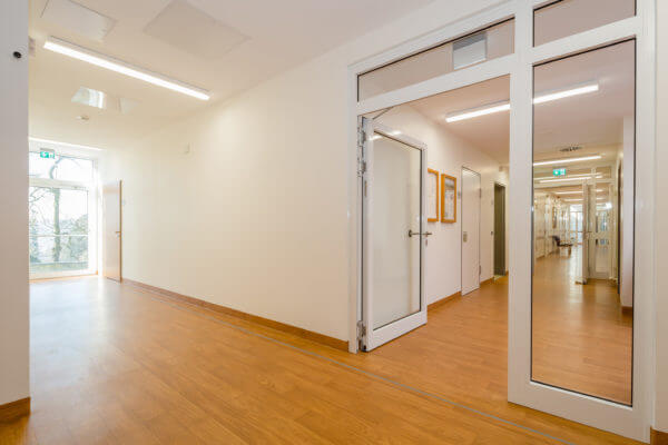 Das sogenannte Gartenhaus, welches sich auf einem der Hügel des weitläufigen Areals befindet, sollte um acht Plätze erweitert werden, wobei der Bestand mit geringen Mitteln ebenfalls modernisiert werden sollte. Der L-förmige Bestandsbau wurde um einen eingeschossigen L-förmigen Erweiterungsbau zu einem U umgebaut. Die Baukörper sind hierbei durch eine denkmalgeschützte Wand eingefasst und so ergibt sich ein geschützter Innenhof, in dem sich die Patienten frei bewegen können. Während im Altbau Patienten mit einem höheren Betreuungsaufwand untergebracht sind, wurde bei dem Anbau darauf geachtet, dass die hier untergebrachten eigenständigeren Patienten Bedingungen vorfinden, die es ihnen ermöglicht, sich weitestgehend selber zu versorgen (eigene Nasszellen, Gemeinschafts- und Essräume etc.). Große Fenster in den Zimmern, Sicht- und Lichtachsen ermöglichen eine gute Orientierung und verbinden innen und außen.