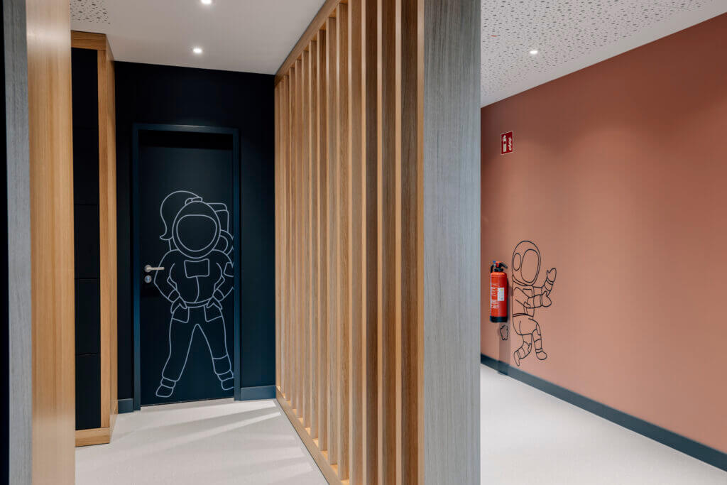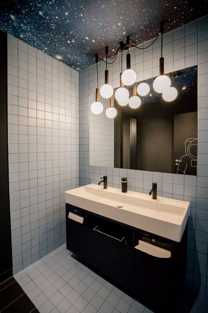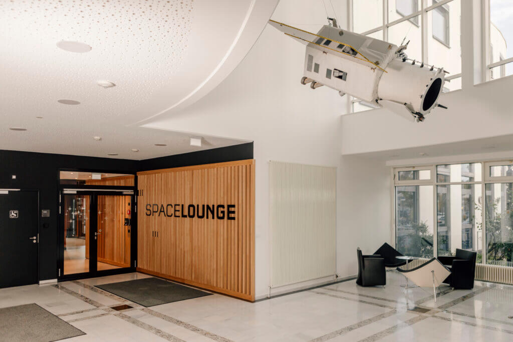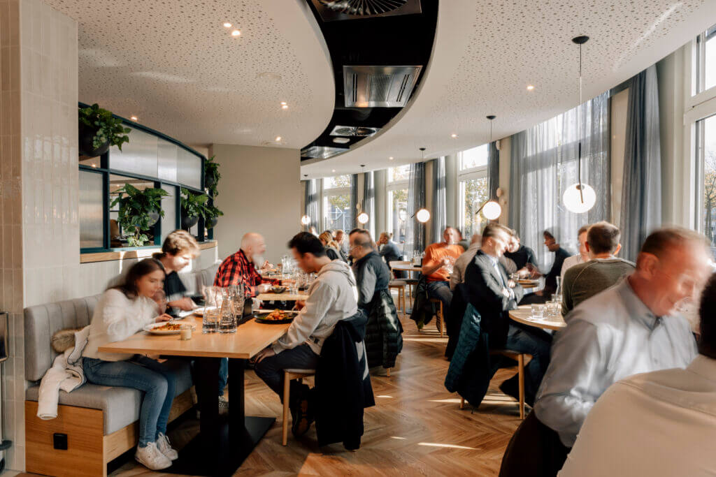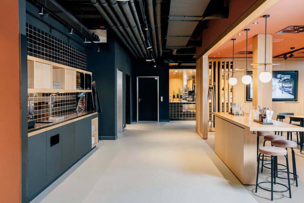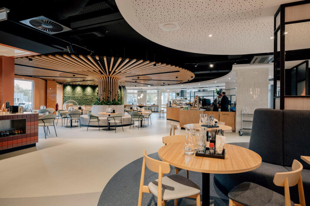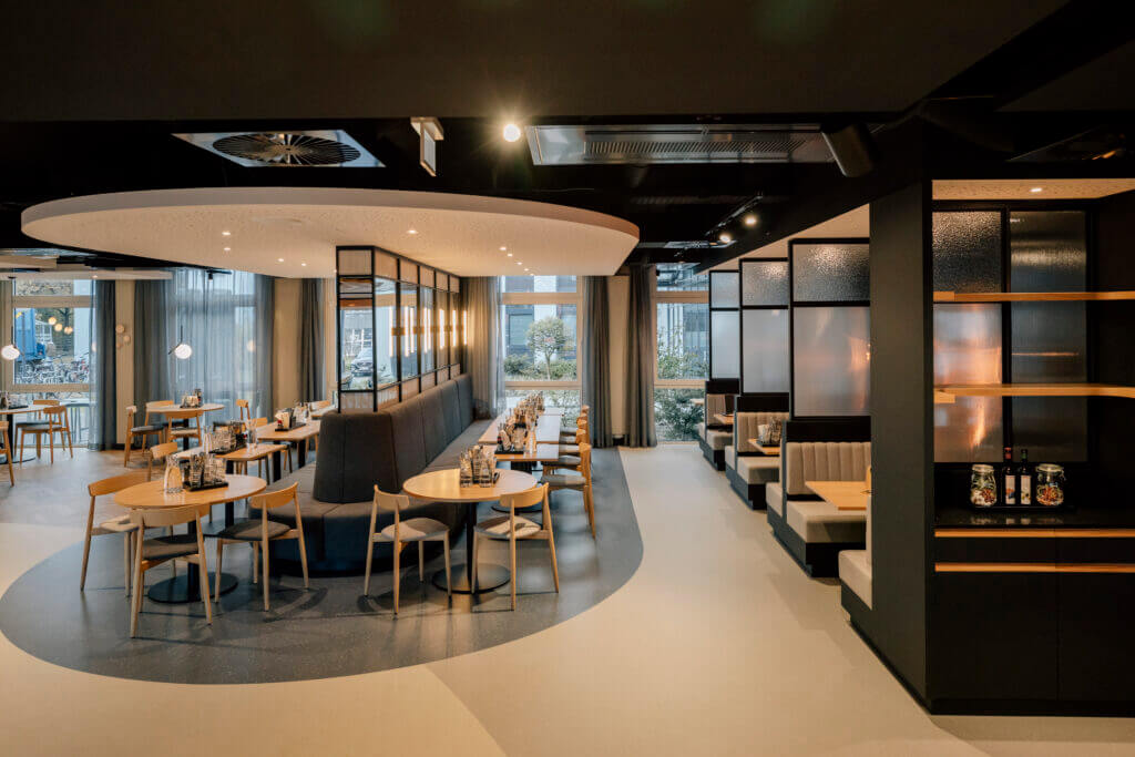 Der Bauherr wünschte sich eine Mitarbeiterkantine, die zur Kommunikation und zum Verweilen einlädt. Und so wurde ein ehemals als Büro genutzter Bereich in einem bestehenden Verwaltungsgebäude, in einem ambitionierten Zeitrahmen, zu einem Mitarbeiterspeisebereich mit einsehbarer Großküche umgebaut