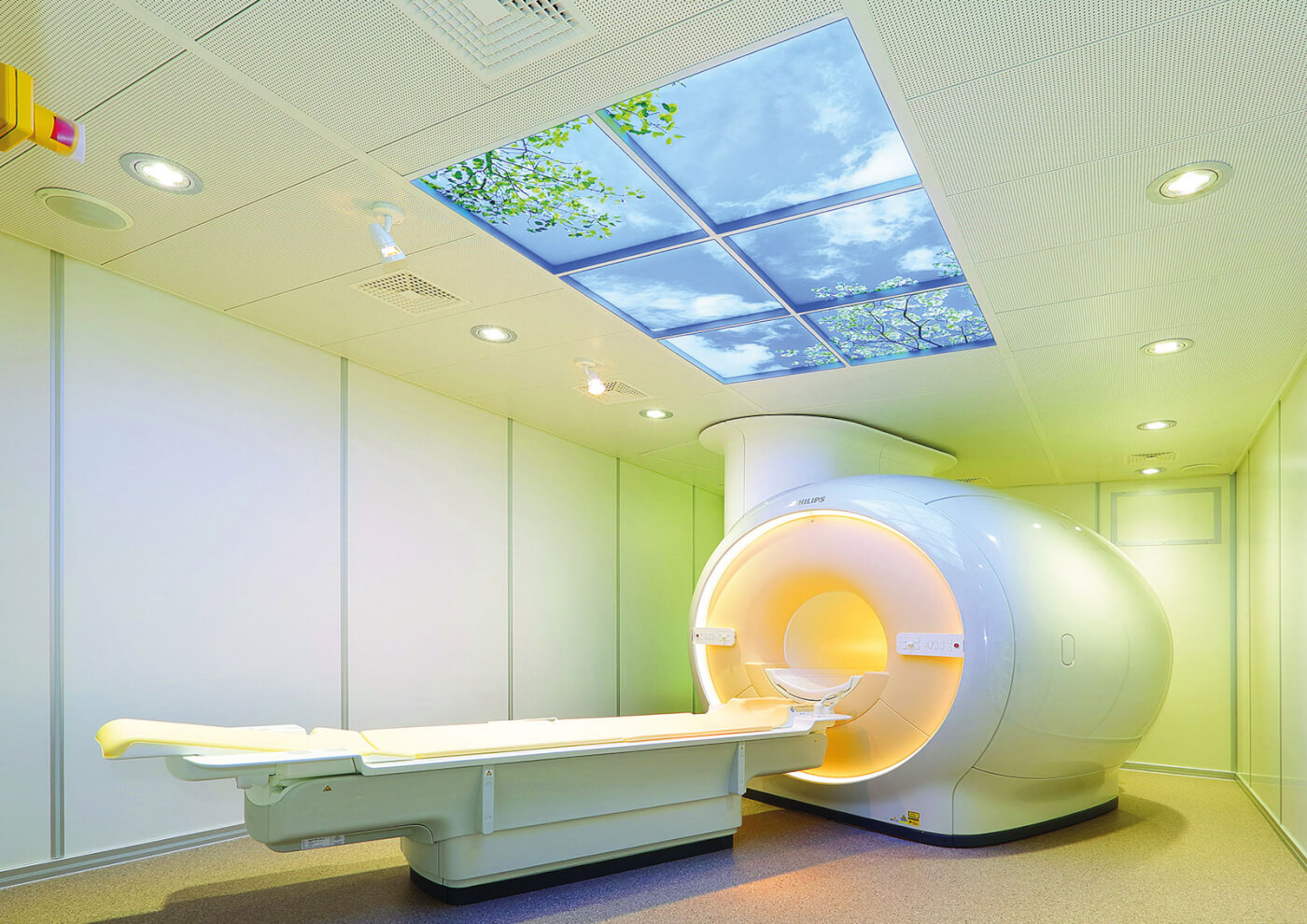 Der Einbau des 1,5 Tesla Kernspingerätes in eine bestehende radiologische Praxis erfolgte im laufenden Betrieb. Das Magnetfeld wird durch Kupferplatten in der Decke zum darüber liegenden Geschoss und in den Wänden sowie Stahlplatten unter der Decke zur darunter liegenden Tiefgarage begrenzt. Um dem Raum den hochtechnisierten Eindruck zu nehmen, wurde ein Himmel in die abgehängte Decke integriert.