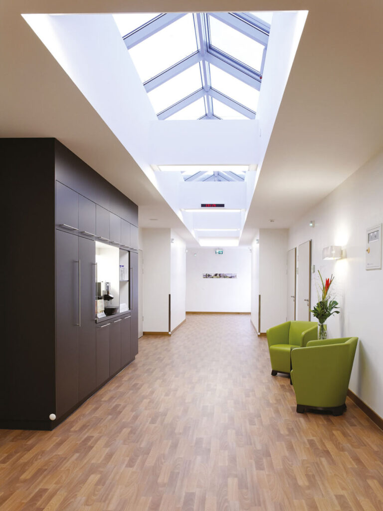 Durch das Aufschneiden des Daches und den Einbau eines Oberlichtbandes lädt der Flur zum Verweilen bei einer Tasse Kaffee am Service-Point ein.